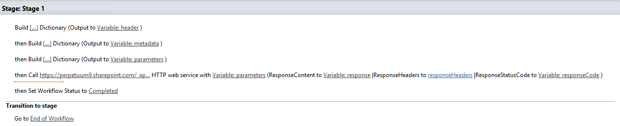 In our new workflow first we will create couple of dictionaries. Dictionary is a new variable type in SharePoint workflows that is used for defining collections of key/pair values and is very important for the Call HTTP service action.